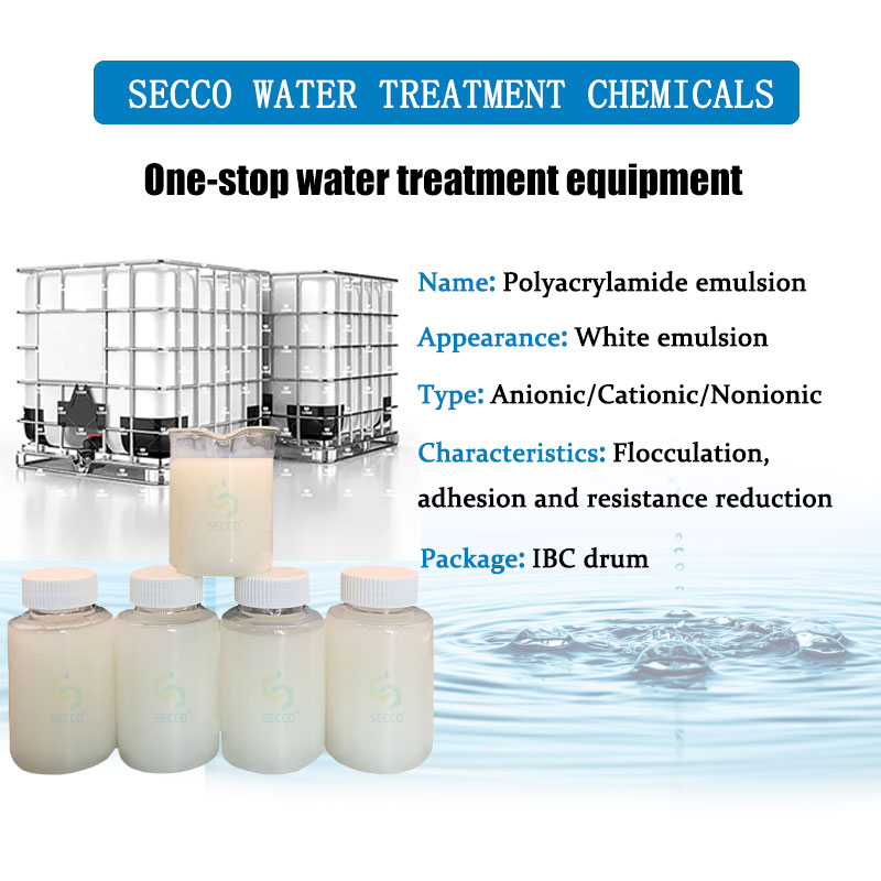 A emulsão de poliacrilamida é preparada por dispersão ou polimerização em emulsão inversa, que é uma forma de líquido de poliacrilamida presente. Além das características dos floculantes sólidos de poliacrilamida, através da cadeia molecular de grupos polares para adsorber sólidos suspensos nas partículas de água, a emulsão poderia formatar os grandes flocos através da ponte entre as partículas ou eletricidade.